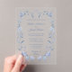 Ces invitations de mariage en acrylique, élégantes et claires, sont dotées d'un cadre floral couleur bleu poussiéreux vintage avec de jolis feuilles botaniques, et d'une calligraphie élégante accompagnée d'un texte classique. Le design en toile bleu à l'air français apportera une touche romantique et chic à votre papeterie mariage.