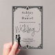 Cet élégant faire-part de mariage acrylique noir et blanc est parfait pour un mariage moderne. Le design simple présente une élégante calligraphie noire, un cadre noir chic et une illustration de mariée et de mariée sur un arrière - plan transparent et clair. La carte d'invitation comprend les détails du mariage au dos au lieu de payer une carte d'enceinte séparée.