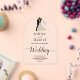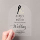 Cet élégant faire-part de mariage acrylique en arc noir et blanc est parfait pour un mariage moderne. Le design simple présente une élégante calligraphie noire et une illustration de mariée et de mariée sur un arrière - plan transparent clair.