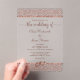 Cet élégant faire-part de mariage acrylique damassé en or rose a un cadre damassé en fausse parties scintillant sur le dessus et le bas, avec des anneaux mariages comme accents. "le mariage de" est écrit dans la typographie de script moderne.