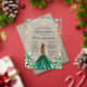 L'invitation présente un design élégant d'inspiration nature avec un cadre aquarelle de verdure et des accents floraux en vert et or. Au centre se trouve l'illustration d'une jeune femme dans une robe vert émeraude aux cheveux fluides ornée d'une couronne dorée. Le texte est coiffé d'un mélange de polices cursives et serif, avec des ornements dorés comme une couronne ajoutant une touche royale. La disposition est équilibrée, alliant sophistication et esthétique formelle gracieuse.