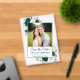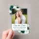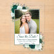 Ces belles cartes acryliques sont une façon spéciale et unique de faire connaître à vos amis et votre famille pour enregistrer la date pour votre prochain mariage. Le design boho chic rustique présente votre photo entourée de roses d'aquarelle peints à la main dans les tons émeraude, menthe et vert sauge, ainsi que des sprigs d'eucalyptus et de verdure du jardin. Il y a de la place ci-dessous pour vos noms, la date et l'emplacement du mariage. Une belle façon de commencer votre voyage mariage.