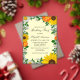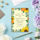 Invitation rustique d'anniversaire de pays avec des tournesols vibrants, des marguerites blanches traditionnelles et des fleurs d'orange contre un arrière - plan jaune clair avec l'haleine du bébé et des accents de verdure botanique