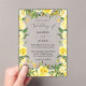 Des fleurs jaunes peintes à la main avec de la verdure ont été utilisées pour créer cette Invitation de Mariage Floral Jaune V3. Il est idéal pour les mariages d'été, les mariages de printemps et les mariages rustiques. Elles sont luxueuses, personnalisées et de qualité sans le prix du luxe. Il est facile de créer vos propres invitations de mariage. Entrez simplement vos informations dans notre modèle facile à utiliser. Amusez vos invités dans l'ambiance pour votre mariage avec vos magnifiques invitations de mariage. Visitez cette page pour créer vos invitations de mariage dès aujourd'hui. Cette faire-part de mariage a une touche spéciale pour rendre vos invitations de mariage étonnantes - Elles sont transparentes et faites avec de l'acrylique. Il peut être clair ou gelé.