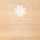 Annoncez votre mariage hivernal avec notre Simple Snowflake Save the Date. Doté d'un flocon de neige blanc et d'une étiquette "Save the Date" en serif et en calligraphie élégante sur un arrière - plan acrylique transparent, ce design saisit la beauté de l'hiver. Personnalisez avec vos noms, votre date de mariage et votre emplacement ci-dessous. Parfait pour les mariages d'hiver, de vacances et de Noël, cette date de sauvegarde donne le ton d'une célébration magique.