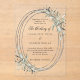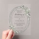 Un arrière - plan clair et transparent. Un cadre argenté ovale décoré de vert sage. Personnalisez et ajoutez vos noms, détails. Texte noir.