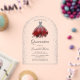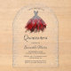Invitation vos invités de quinceañera dans le style avec cette élégante invitation de fête avec une belle robe brillante argent et vin rouge et vos détails de fête en typographie grise script de calligraphie pour vous de personnaliser bordé avec la fausse parties scintillant aqua sur un voir à travers l'arrière - plan acrylique. Conçu par Susan Coffey.