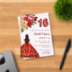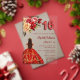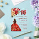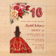 Une invitation moderne, élégante et glamour pour une fête Sweet 16, 16e anniversaire. Un arrière - plan transparent, une fille portant une robe rouge et or et des roses rouges, roses et dorés, des fleurs. Le nom est écrit avec un script de style moderne écrit à la main. Personnalisez et ajoutez les détails de votre fête.