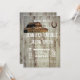 Une invitation rustique de mariage campagnard de style frais de typographie avec la grange rustique de pays en haut à gauche au faisant le coin et un fer à cheval du côté droit. L'arrière - plan est arrière - plan en bois affligé d'impression de grange foncée.