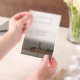 Faire-part de mariage photo translucide avec une photo du couple heureux sous une formulation informelle de faire-part de mariage avec vos noms en grandes lettres. Un élégant faire-part de mariage photo en velours avec un arrière - plan translucide et un mariage informel en gris crayon.