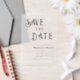Élégant Script minimal Enregistrer la date Mariage Vellum Invitations sont modernes et uniques à utiliser comme superposition ou envoyer comme carte à votre invité. Personnalisez avec vos informations.