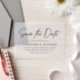 Annoncez votre prochain mariage avec une élégance sans effort à l'aide de notre vellum Décontracté Black Script enregistrer la date. Avec "Save the Date" dans un élégant script manuscrit noir, ce design moderne et minimaliste est magnifiquement placé contre un arrière - plan en vellum. Idéal pour n'importe quel style de mariage, décontracté à formel, cette sauvegarde personnalisable vous permet d'ajouter vos noms, date de mariage, emplacement, site Web mariage, et tout autre détail important. Parfait pour les couples qui veulent un look chic et contemporain, ce vellum sauver la date donne le ton d'une fête mémorable.