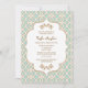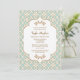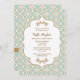 Et beau invitations nuptiales de douche inspirées par Marocain français élégant avec un aqua bleu et pâle de répétition de coquille d'oeuf, la conception géométrique légère de motif de sarcelle d'hiver et d'or de vert bleuâtre et les flourishes floraux hued d'or. Cet invitation classieux et luxe est parfait pour la douche nuptiale orientée de mille et une nuits formels, exotiques, marocains, ou d'Aladdin. Le dos des ces coutume, invitations de fantaisie de cadre et annonces peut être personnalisé avec bientôt pour être le monogramme de la jeune mariée et le nom d'événement sur la forme de quatrefoil et la conception imprimée de regard de ruban. Illustration et © Chrissy H. Studios, LLC de conception. Tous droits réservés.
