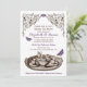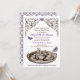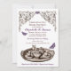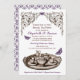 Les invitations nuptiales de thé de jardin pourpre comportent un service à thé et des papillons avec un en-tête floral de rouleau et des motifs fleuris dans pourpre, brun, et le blanc.