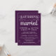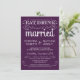 Mangez, buvez, et soyez marié -- Invitations rustiques de mariage campagnard de style vintage -- Ajoutez les noms de jeunes mariés et les détails de mariage dans ce modèle facile à utiliser. Élégant mais amusement et lunatique, la calligraphie de manuscrit de style de tableau peut être modifiée pour votre rétro thème formel ou semi-formel de mariage. Rouleaux tourbillonnants et bouclés et typographie de vieux-mode sur l'arrière - plan pourpre de sangria d'aubergine violette d'améthyste. Le style moderne décontracté est parfait pour des mariages contemporains à la mode avec un contact d'amusement de charme sophistiqué pour les couples traditionnels. Veuillez nous contacter pour l'aide avec la personnalisation si vous avez besoin de la pièce supplémentaire pour vos détails de mariage. D'autres tailles et styles de tableau disponibles.