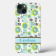 This personalized Case-Mate Barely There iPad mini case has a white and aqua blue striped background with an abstract pattern of lime green, turquoise, brown and white flowers and circles with a band to add your name, initial, monogram or other text to. This modern and trendy new case makes a chic statement for the hip young fashionista! If you need assistance, email niteowlstudio@gmail.com.