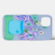 iPhone 13 case with a hand drawn blue flower pot, with pink and purple leaves, and mixed coloured flowers. The background is blue and the table cover is green. You can add your name to the pot, or the upper right corner.