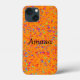iPhone 13 Mini Case in orange with mixed coloured small hearts in an all over design. The name on the phone can be changed.
