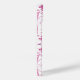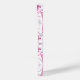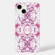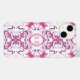 This iPhone 14 phone case is shown in a pink and white swirl print design.