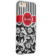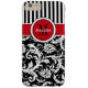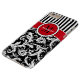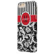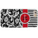 This personalized black and white Case-Mate custom iPhone 6 Plus case has a floral damask and striped background pattern with a red and white band and circle to add your name, initials, monogram or other text to. This modern and trendy new case makes a chic statement for the hip young fashionista! If you need assistance, email niteowlstudio@gmail.com.