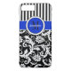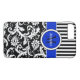This personalized black and white Case-Mate custom iPhone 7 case has a floral damask and striped background pattern with a royal blue and white band and circle to add your name, initials, monogram or other text to. This modern and trendy new case makes a chic statement for the hip young fashionista! If you need assistance, email niteowlstudio@gmail.com.