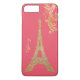 Glam iPhone 7 Plus coque, avec une parties scintillant aux tons dorés et brillants, en forme de silhouette de la Tour Eiffel, face à un arrière - plan rose corail. Personnalisez le texte doré jaune, pour vous-même ou comme une excellente idée cadeau.