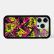 A top-down, flat lay photograph of an iPhone, possibly an iPhone 13 Pro model, encased in a custom, vibrant street-art designed protective case. The case features a chaotic yet dynamic collage of fragmented geometric shapes and bold graffiti tags, rendered in a high-contrast palette of electric neon yellow, hot pink, and black. Text elements are integrated into the design, including 'URBAN', 'STREET', 'EDGY', and 'STREET VIBES', all in stylized graffiti fonts. Key visual elements include a multi-faceted diamond icon at the top right and numerous arrows and stylized line-work woven throughout the pattern. The camera array is clearly visible through a precise cutout. The phone lies centered against a clean, neutral, finely textured grey surface. The overall aesthetic is raw, energetic, and urban.