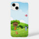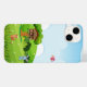 Bring a touch of playful charm to your iPhone 14 with our adorable cartoon animal and treehouse case. This heartwarming design features a whimsical scene with a cozy treehouse home to three mischievous monkeys peeking out from within. The vibrant landscape includes a sweet blue bunny rabbit sitting amongst the green grass dotted with tiny white flowers, a curious reddish-brown squirrel, and a cheerful pink bird soaring in the sunny sky. A bright yellow sun with a friendly face peeks from behind fluffy white clouds, all set against a clear blue backdrop. This delightful and engaging design is printed with durable, high-quality inks to ensure long-lasting vibrancy and protection against scratches and minor impacts. Available in various case styles, from slim and lightweight to more robust options, this case will add a touch of joy and personality to your iPhone 14.