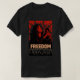 This T-shirt carries a street-poster aesthetic: harsh contrast, loud red/black energy, and a composition that reads from across the room. The design features a woman in silhouette exhaling smoke like a signal, a burning portrait, and a crowd rising beneath a single message—FREEDOM.