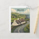 A vintage postcard of Ireland shows tranquil fields, quaint cottages, and a calm sea, all rendered in warm, nostalgic colours.