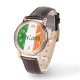 Brown leather perfect square eWatch watch with an image representing Ireland's flag. The green colour on the flag represents the native people of Ireland (who are mostly Roman Catholic). The orange colour represents the British supporters of William of Orange who settled in Northern Ireland in the 17th century (most of whom are Protestant). The white in the centre of the flag represents peace between these two groups of people. Optional clock face. See the entire St. Patrick’s Day Wrist Watch collection in the HOLIDAYS section.