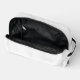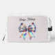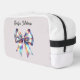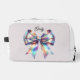 This makeup toiletry bag features a charming iridescent bow personalized with a name. Envision the light dancing off the wonderful colours of the bow, all set against a powder pink background, making it a functional yet stylish accessory. The bow and personalization is also on the backside of this bag.