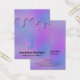 The background of our iridescent foil earring display blends shades of pink, purple and blue in an artistic abstract pattern... perfect for creatives who design jewelry as their business or side hustle. Holographic metallic drips taken from the same pattern have an embossed look as they border the top of the card. The embossing is a graphic technique that is printed on the paper, rather than being an actual physical element overlaid on the card. On front of the card are two printed circles to guide your punching of the holes for the earrings and, below that, your business name and boutique services. All text on front and back of this jewelry display card can be easily and quickly revised on the personalization template.