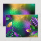 Textural iridescent mardi gras background with spots of purple, yellow and green, decorated with fluffy feathers and shiny beads. Mardi gras holiday.