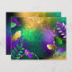 Textural iridescent mardi gras background with spots of purple, yellow and green, decorated with fluffy feathers and shiny beads. Mardi gras holiday.