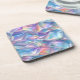 A blue, orange, gold and purple iridescent, metallic geometric design perfect for a beverage coaster.