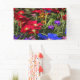 A riot of colourful spring flowers in bright red, blue, purple, pink, and orange.