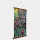 Decorate a living space with this vertical, hanging wall tapestry with wooden tops that features a photographic image of Iris blooms growing alongside a garden park bench. A lovely, floral image!