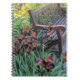 A personal sized, spiral bound notebook for notes and journalling that features a cover photo image of Iris blooms and a wooden, garden park bench. A lovely, floral design!