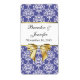 Elegant wedding mini wine labels ready for you to personalize with your own information. Trendy iris blue and white damask pattern, on the top and bottom of the label, with a white text area, in the centre, edged on either side with a gold tone line, and a gold tone bow, on the bottom, of the text area. Text is fully customizable to suit your wedding needs. Great for your wedding reception table or gift wines.