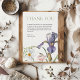 The design showcases a harmonious blend of nature's most enchanting blooms: the majestic iris, symbolizing faith and hope; the calming lavender, known for its grace and purity; and a delicate array of wildflowers, representing the free-spirited love that brought you together. Each flower is intricately illustrated, capturing the soft, ethereal beauty that only nature can provide.