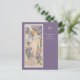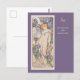 A postcard with the vintage illustration by Alphonse Mucha from The Flower Series, Iris (1898), which has been digitally restored and enhanced. A portrait of a woman in an evening gown surrounded by lavender iris blooms.