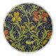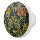 This design features a print of a fabric design created by the British artist William Morris (1834–1896), who is associated with the Arts and Crafts Movement. It depicts blue and orange iris flowers in an elegantly symmetrical pattern. The flower is named after Iris, who was the Greek goddess of the rainbow and a messenger for the Olympian gods, carrying messages down to humanity. The leaves and stems of the iris plants are depicted in blue and green. There are a few yellow birds perching on some of the plants' foliage. The original pattern was designed by William Morris in 1887.