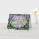 Background is repeated iris pattern. Focal point is large iris in oval shape blended with background pattern. Oval shape is embossed and shows dimension. Colourful text reads, "Thinking of you."