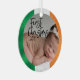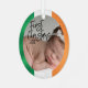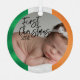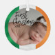 This cute custom ornament features an Irish Christmas theme. A sample baby photo is placed in the centre which you can personalize to include your baby's own custom photo or other picture of your choice. The title "First Christmas" is printed to the left in an elegant script font, followed by a sample year. The border features a green, white, and orange texture design to resemble the flag of Ireland.