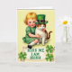 This greeting card shows a golden-haired child with bright blue eyes and rosy cheeks hugging a calm tabby cat close, their faces turned toward each other with an easy, affectionate closeness 💚. The child wears a green-and-white plaid dress, and the cat’s white, ginger, and brown fur is softly shaded with gentle stripes. Behind them is a pale yellow-green background that looks lightly luminous, keeping the focus on the cuddle at center. The cat adds a St. Patrick’s Day touch with a tiny leprechaun top hat featuring a black band and a small gold buckle ☘️. Soft lighting smooths the scene, giving the child’s smile and the cat’s relaxed posture a cozy, friendly feel. Along the lower portion, a flowing banner stretches across the card with the words “KISS ME I AM IRISH” set in emerald green lettering. Small four-leaf shamrocks sit on either side of the banner, and the cat’s striped tail curls upward in a gentle arc near the bottom edge.