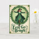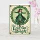 The front design shows a woman standing full-length inside a circular wreath of shamrocks, her arms open as if she’s welcoming someone close with an easy, friendly warmth 💚. She wears layered emerald greens—a wide-brim hat, a tailored coat, and a flowing dress that looks like it’s caught mid-sway—giving the scene a gentle, old-time charm. Her auburn hair falls in soft waves, and a small gold necklace sits at her collar, adding a tender touch like she dressed up for a special meet-up. The shamrock ring is a rich green, and the space inside it fades to a light lime tone, while the outer background shifts to a creamy, aged-paper color. Beneath her, the words “Erin Go Bragh” sit centered near the bottom in dark green lettering, with curling vine details and extra shamrocks around the text ☘️. The careful contrast of greens against warm off-white makes her smile and open posture feel like an invitation to step closer. Share St. Patrick’s Day sentiments with someone you care about.