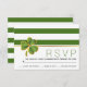 This lovely wedding RSVP response card features Irish clover or shamrocl leaves and a green and white striped pattern. Your text is on a white band with a gold stripe. It is perfect for a Saint Patrick's Day wedding.