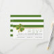 This lovely wedding RSVP response card features Irish clover or shamrocl leaves and a green and white striped pattern. Your text is on a white band with a gold stripe. It is perfect for a Saint Patrick's Day wedding.