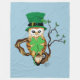 Cute barn owl wearing as green leprechaun top hat with two clovers on it.